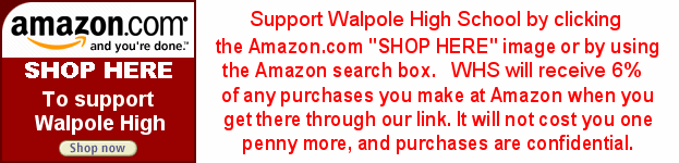 Walpole High School has signed up with Amazon.com as an Amazon Associate to share their profit. If you plan to shop at Amazon simply access their website by clicking on the Amazon link on the WHS site, a portion of your sale will be returned to Walpole High School. There will be no additional cost to you, and your order will remain completely confidential at Amazon.
